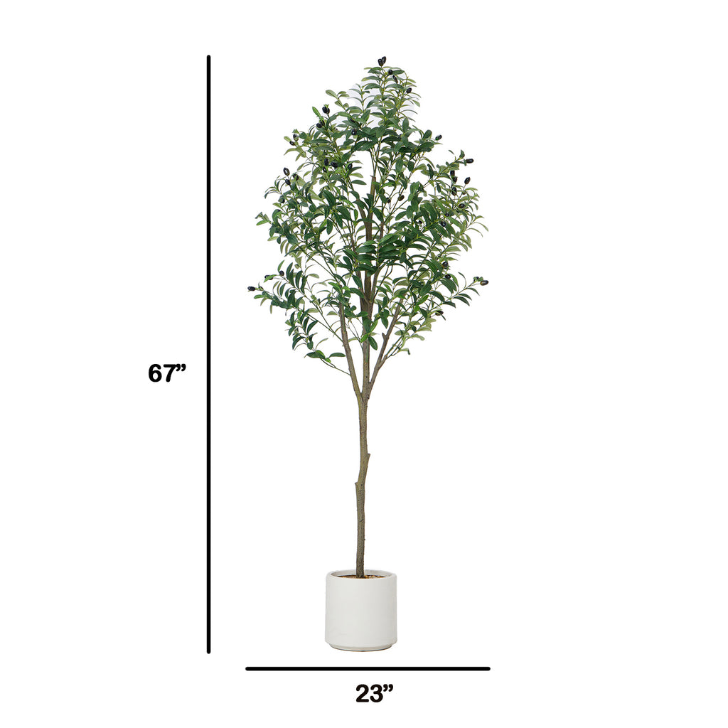 Standing proudly at 67", the artificial Olive tree commands attention with its lifelike appearance. Its sturdy trunk and realistic branches are adorned with delicate, silvery-green leaves that mimic the Mediterranean beauty of real olive trees. Perfect for adding a touch of nature to any indoor setting, this faux olive tree brings timeless elegance without the need for watering or upkeep.