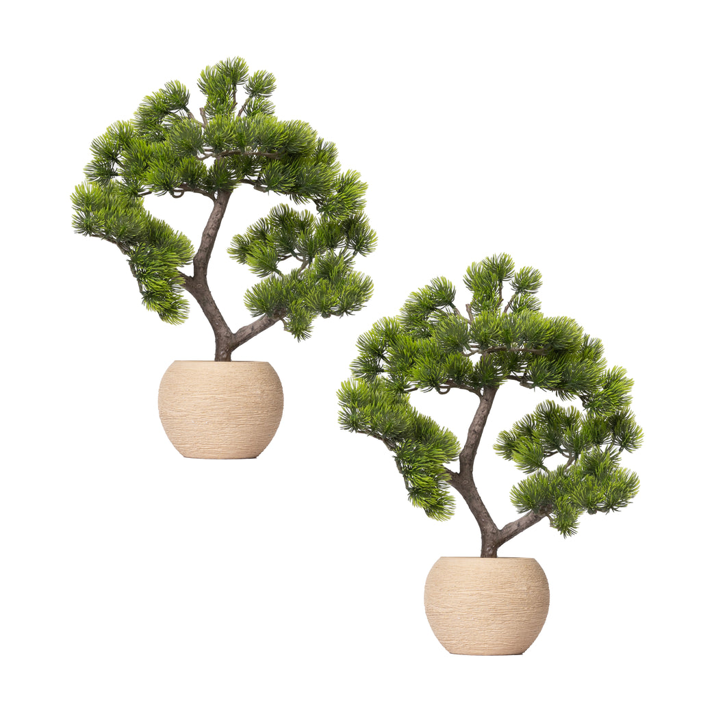 2-pack 14” Faux Bonsai Trees with real touch leaves, in a modern beige ceramic vase