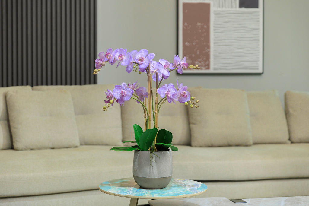 Experience the lifelike quality of our Real Touch 27.5" purple orchid arrangement. This stunning beauty, complete with delicate petals and nestled in a stylish ceramic planter, radiates elegance in any setting. Perfect for home or office decor, it requires no maintenance and offers lasting charm and natural appeal.