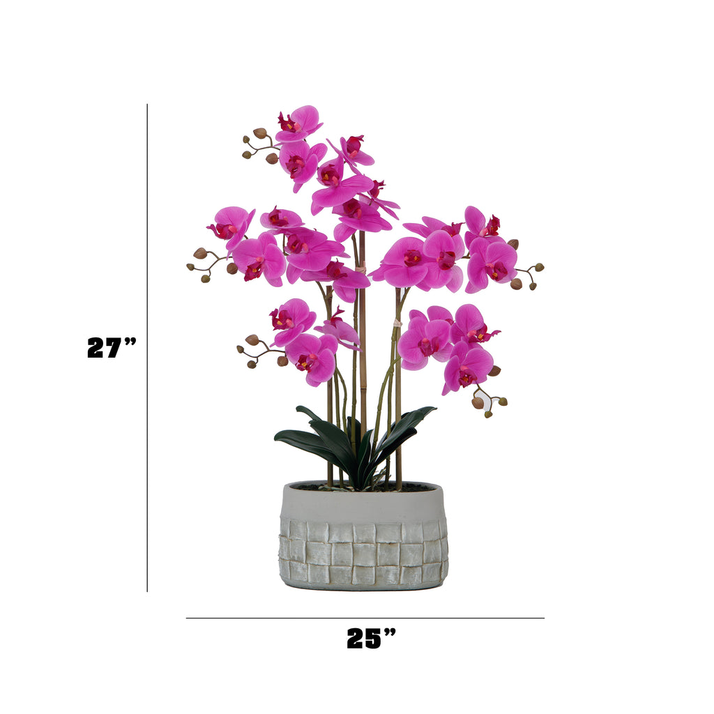 Experience the lifelike quality of our Real Touch 27" purple orchid arrangement. This stunning beauty, complete with delicate petals and nestled in a stylish ceramic planter, radiates elegance in any setting. Perfect for home or office decor, it requires no maintenance and offers lasting charm and natural appeal.