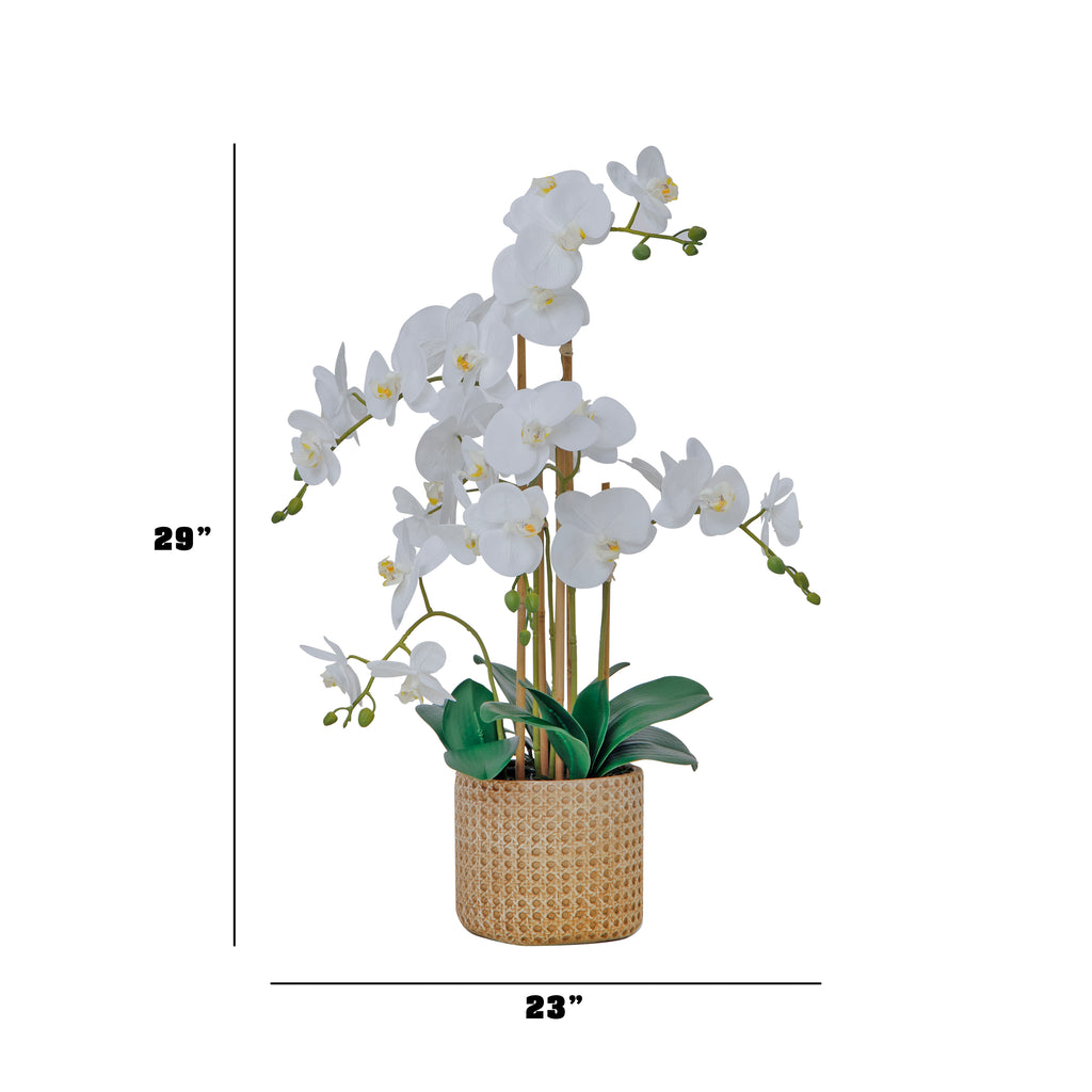 Experience the lifelike quality of our Real Touch 29" white orchid arrangement. This stunning beauty, complete with delicate petals and nestled in a stylish ceramic planter, radiates elegance in any setting. Perfect for home or office decor, it requires no maintenance and offers lasting charm and natural appeal.