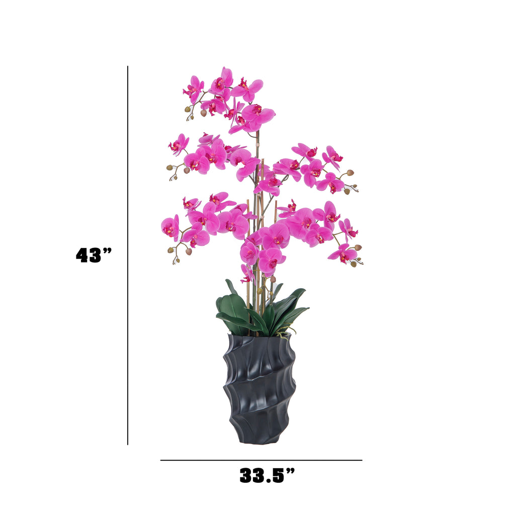 Experience the lifelike quality of our Real Touch 43" purple orchid arrangement in a tall black planter. This stunning beauty, complete with delicate petals and nestled in a stylish ceramic planter, radiates elegance in any setting. Perfect for home or office decor, it requires no maintenance and offers lasting charm and natural appeal.